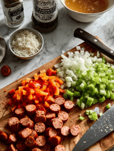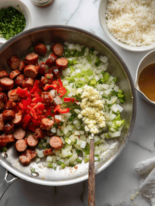 Step 3: Sauté the holy trinity (onion, celery, bell pepper) until soft and fragrant, about 5 minutes.