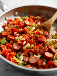 5. Stir in the diced tomatoes and cook for another 2 minutes until they meld with the sausage and vegetables, creating a rich base.
