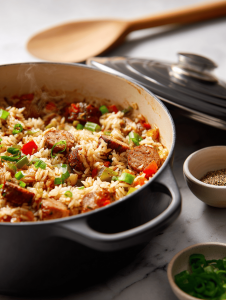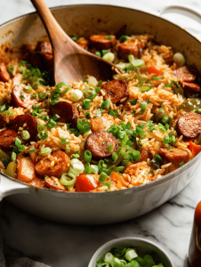 Jambalaya is a hearty one-pot dish featuring smoky sausage, aromatic vegetables, and flavorful spices cooked with rice until tender. The dish boasts a vibrant, smoky aroma with a slightly spicy kick, culminating in a comforting, slightly saucy final appearance with tender rice and chunks of sausage. Its rustic charm and layered flavors make it a satisfying meal perfect for sharing.
